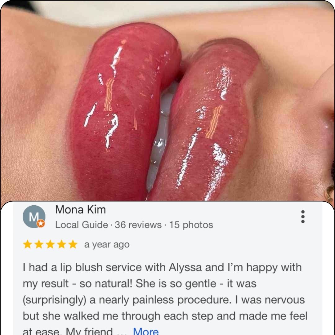 - Maintenance: Most clients opt for a yearly lip blush touch up to keep pigment looking fresh and to re-defined the shape if needed.